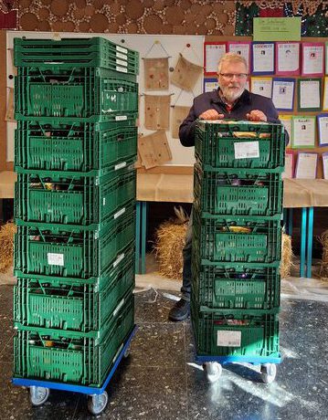 Die Schülerinnen und Schüler der Grundschule Osterwald haben zum Erntedankfest in diesem Jahr wieder haltbare Lebensmittel für die Tafel Garbsen gesammelt. Als wir heute zur Abholung mit unserem Lieferwagen vorfuhren, waren wir ehrlich überrascht, wieviele Lebensmittel und Hygieneartikel in unsere mitgebrachten Transportkisten laden durften: 11 vollgepackte Kisten waren es geworden!!